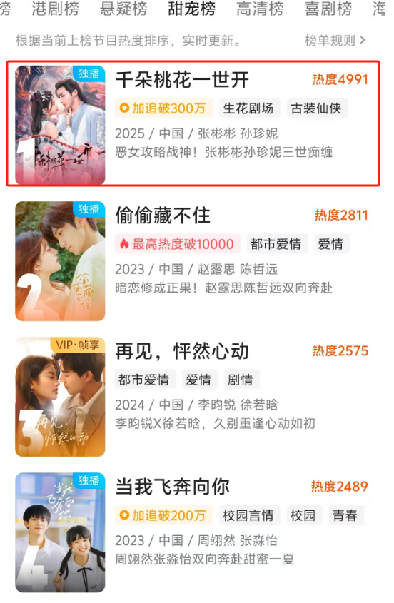 《千朵桃花一世开》首播三集,直接拿下热榜第一。