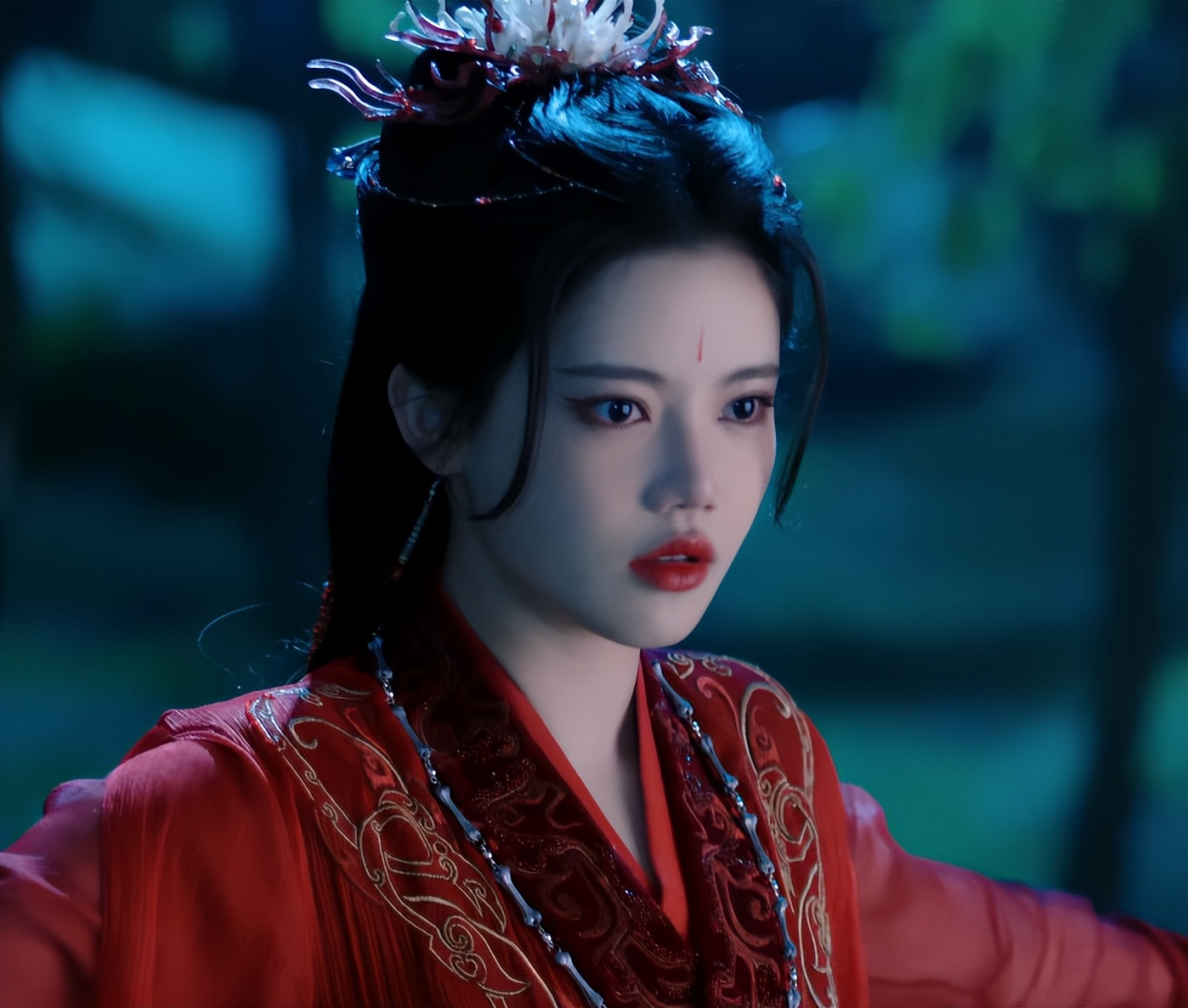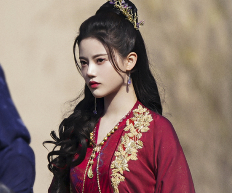 剧中的暮悬铃一身红衣,发饰繁复却不显得夸张,明艳的长相完全贴合她的人设。